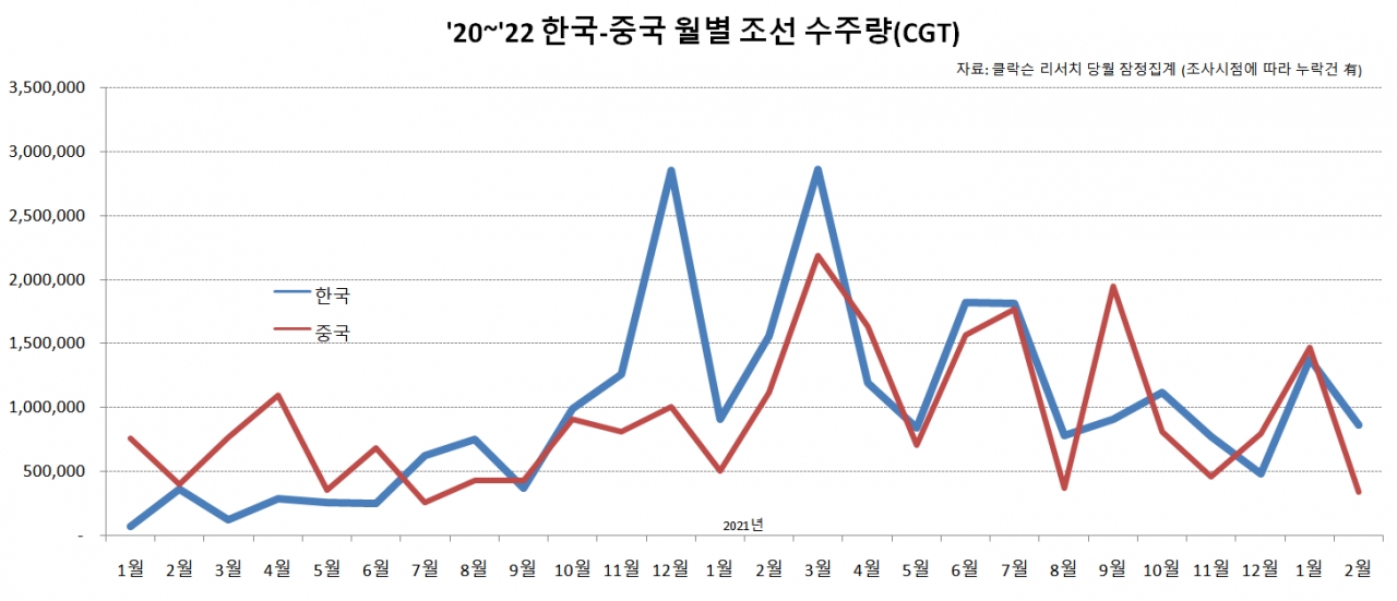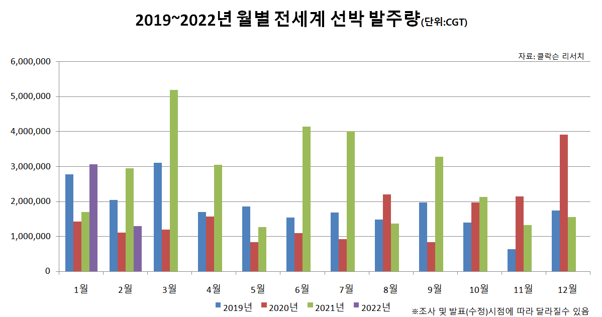 조선해운 분석기관인 클락슨리서치에 따르면 올해 2월 전 세계 신규 선박 발주는 129만CGT(표준화물선 환산 톤수)를 기록했다.