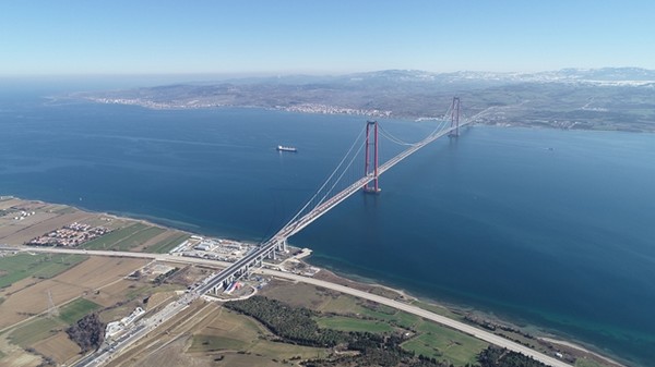 차나칼레대교는 대교 총 길이가 3563m, 주탑 간 거리는 2,023m인 세계 최장 현수교다. 소요 강재 전량에 포스코 강재가 적용됐다. 포스코는 차나칼레대교의 주탑에 들어가는 후판 3만9000톤, 데크용 후판 5만3,000톤과 케이블용 선재 4만4,000톤까지, 총 13만6,000톤의 강재를 전량을 공급했다.