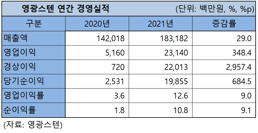영광스텐은 지난해 경영실적으로 매출액 1,831억8,200만원을 달성했다. 전년 1,420억1,800만원 대비 약 400억원, 29% 급증했다.