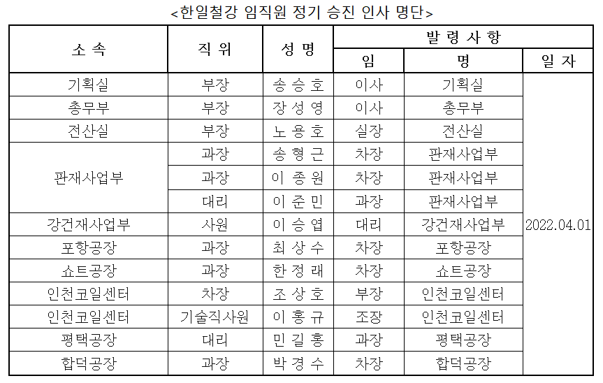 독립 열연 스틸서비스센터(SSC) 한일철강(대표 엄정헌)이 4월 1일부로 임직원 승진 인사를 단행했다. 이번 인사 조치로 기획실 송승호 부장과 총무부 장성영 부장이 이사로 승진 임명됐다. 전산실 노용호 부장은 실장으로 승진됐다.