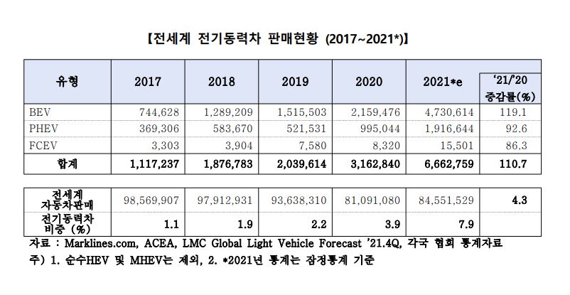 한국자동차산업협회(회장 정만기)는 지난해 전세계 전기차(BEV, PHEV, FCEV) 판매가 약 666만대, 전년대비 110.7% 증가하여 2배 이상 성장세를 기록했다고 발표했다. 2021년 세계 자동차 시장은 공급망 불안과 코로나19 바이러스 확산으로 인해 생산이 지연되는 등으로 인해 4% 수준의 완만한 회복세를 보인 가운데 전기차 시장은 높은 성장률을 달성한 것이다.