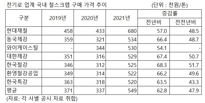 이는 2020년의 톤당 33만7,000원 대비 62.8%가 상승한 수준이다. 지난해 이들 업체가 구매한 국내 철스크랩 평균 가격은 2019년의 37만1천원 대비로도 47.9% 상승을 나타냈다.