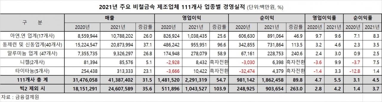 2021년 국내 비철금속 업체들의 경영실적은 메탈 원자재 가격의 상승으로 인해 외형과 수익성 모두 크게 호전된 성적을 거뒀다. 특히 업계 전체의 매출이 불과 1년 사이에 40조원대로 급성장했으며, 수익성 호조로 인해 영업적자를 기록한 업체 수는 절반가량 줄었다.
