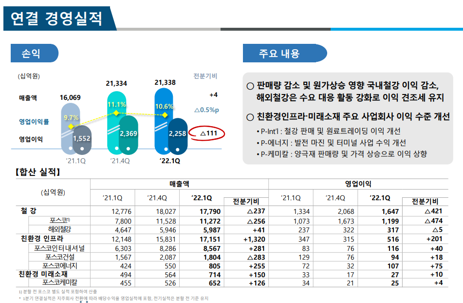 포스코홀딩스의 2022년 1분기 연결기준 매출액은 21조3,380억으로 전년동기대비 32.8% 늘었다. 영업이익은 2조2,580억원으로 직전 4분기대비 4.7% 감소했으나 전년동기대비 45.5% 증가한 것으로 나타났다. 영업이익률은 전분기대비 0.5% 감소한 10.6%를 달성했다.