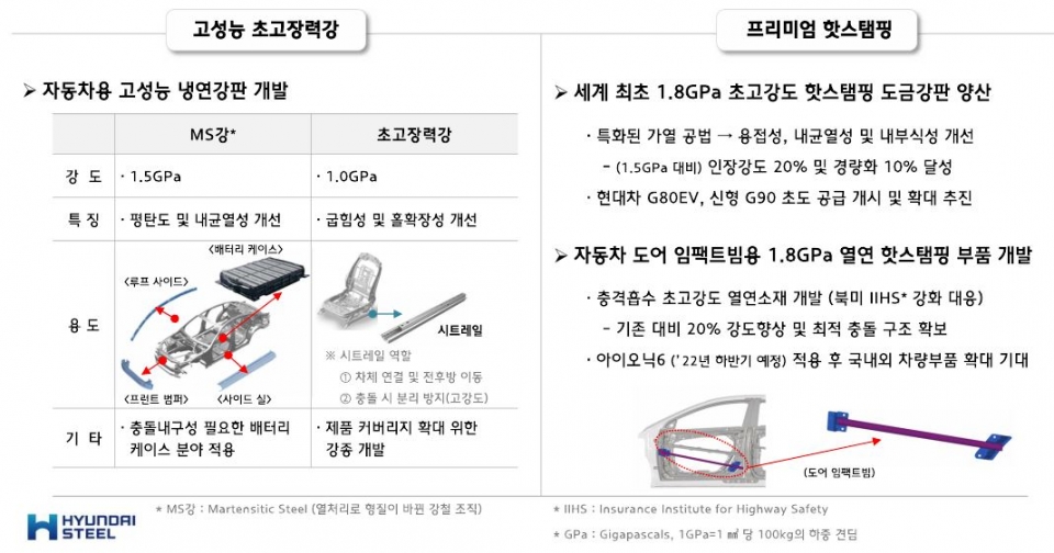 경량화와 충돌 내구성을 동시에 충족해야 하는 전기차 배터리 케이스 분야에 적용되는 1.5GPa MS강판(MS: Martensitic Steel, 열처리로 형질이 바뀐 강철 조직) 개발을 완료했으며 세계 최초로 1.8GPa 핫스탬핑 도금강판을 양산해 자동차 경량화에 앞장서고 있다고 설명했다.