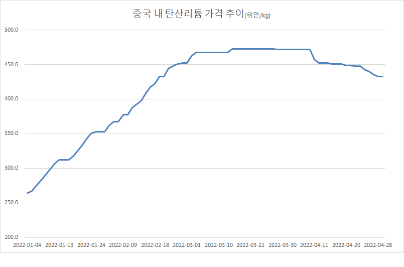 하지만 지난 4월 1일 호주의 리튬 광산업체인 올켐(Allkem)이 정광 리튬 가이드 가격을 대폭 인상한다고 발표했고, 2분기 리튬 정광의 평균 판매 가격은 톤당 5,000달러에 이를 것으로 예상는데 이는 1분기보다 약 125% 크게 증가한 것이다. 스포듀민 농축액 현물가격도 상승세를 보이고 있어서 원료 측면에서 리튬 가격이 지속적으로 하락할 가능성은 낮아 보인다.