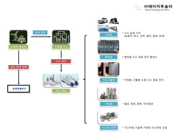 에이치투솔라는 개질추출 수소, 부생수소 추출 방식이 아닌 신재생 에너지 발전을 통해 만들어진 잉여전력을 수전해기기에 적용해 완전한 그린 수소 추출방식을 활용한다. 태양광 발전, 풍력 발전, 조력 발전 등으로 발전한 전기에너지 중 남는 전력을 수전해기기에 주입하고 물(H2O)이 분해되며 생산되는 수소(H)를 추출, 포집하는 방식이다.