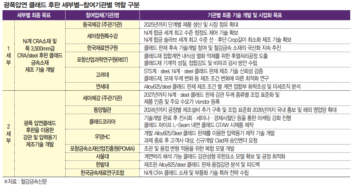 이를 위해 국내에서 다수의 판재류 압연 노하우 및 기술을 갖고 있는 동국제강과 특수강 소재 개발 및 반제품 생산에 특화된 세아창원특수강이 1세부 및 전체 클래드 후판 개발에 주요 역할을 수행하고 있다.