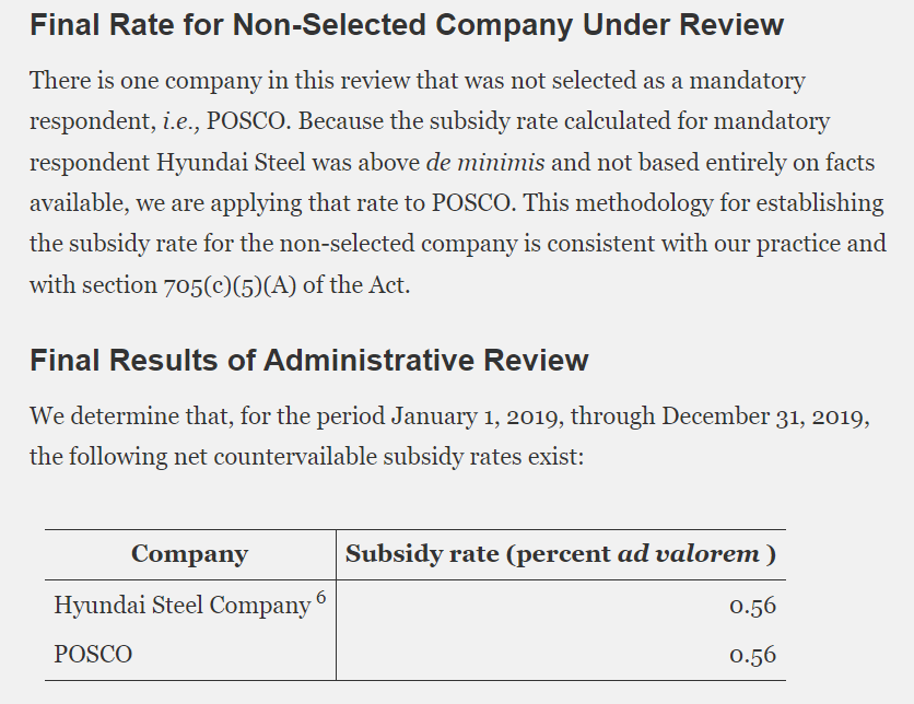 이번 발표에서 포스코와 현대제철이 상계관세로 0.56%(보조금 비율)을 동일 부과받았다. 지난해 10월에 열린 연례재심 예비판정 관세와 동일한 상계관세율이 적용됐다. 상계관세의 경우 0.5% 미만 세율이 인정되면 실질적 관세를 부과하지 않는다.