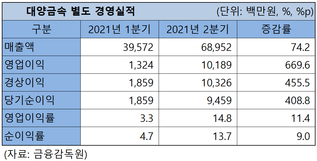 대양금속 관계자는 “1분기 사업성과에 대한 기대감으로 올해 매출 성장 및 수익성 개선 기대되고 있다”라고 밝혔다.