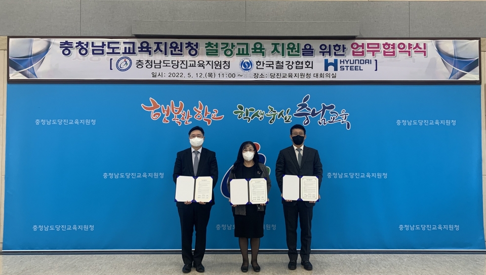 한국철강협회, 충청남도당진교육지원청, 현대제철(이하 협약기관)은 5월 12일 충청남도당진교육지원청에서 충청남도 당진지역 철강교육지원을 위한 업무협약을 체결했다.