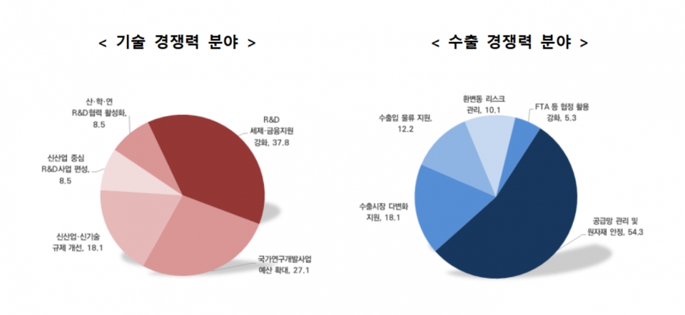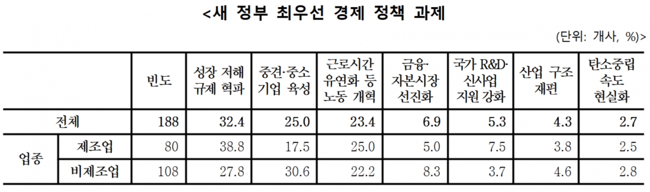 중견 제조업은 ‘규제 혁파(38.8%)’, 비제조업은 ‘중견·중소기업 육성(30.6%)’을 1순위 경제 정책 과제로 선택했다.