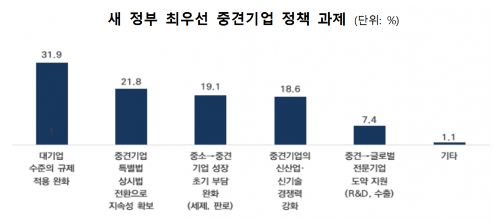 중견기업계가 지목한 최우선 경제 정책 과제는 ‘성장 저해 규제 혁파(32.4%)’, ‘중견·중소기업 육성(25.0%)’, ‘근로시간 유연화 등 노동 개혁(23.4%)’ 등 순으로 조사됐다.