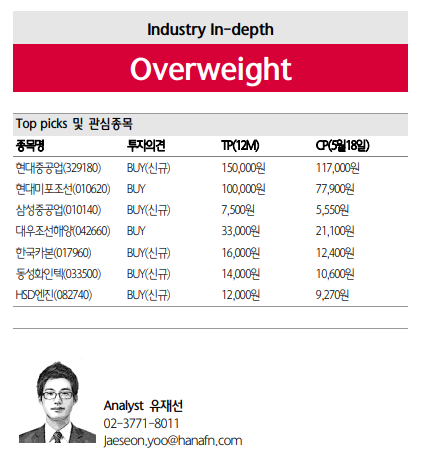 그럼에도 유재선 연구원은 중장기적인 조선주 전망이 긍정적이라고 밝혔다. 유 연구원은 “하반기에는 철광석과 원료탄의 추가적인 가격 강세가 나타나지 않을 경우, 원만한 실적 개선 흐름이 확인될 것으로 판단된다”라며 “대부분의 조선사가 2년 이상 수주잔고를 이미 확보한 상황인 가운데 남은 기간의 수주 실적에 따라 기말 수주잔고는 연간 매출 인식에도 추가 증가 가능성이 존재한다”라고 풀이했다.