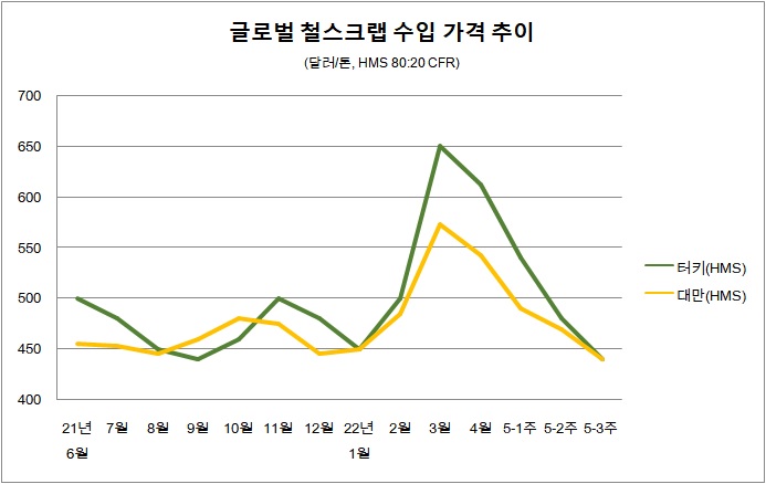 외신에 따르면 5월 셋째 주 미국에서 대만으로 향하는 컨테이너 철스크랩 가격은 HMS(80:20) 기준 톤당 440달러(이하 CFR)로 전주 대비 30달러 추가 하락했다.