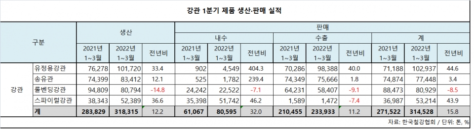 한국철강협회에 따르면 유정용강관의 1분기 생산은 10만1,720톤으로 지난해 같은 기간 7만6,278톤 보다 33.4% 증가했다. 수출의 경우 9만8,388톤으로 지난해 같은 기간 보다 40% 증가했다. 송유관은 8만3,412톤을 생산해 지난해 같은 기간 7만4,399톤 보다 12.1% 증가했다. 수출은 7만5,666톤으로 지난해 같은 기간 대비 1.8% 늘었다.