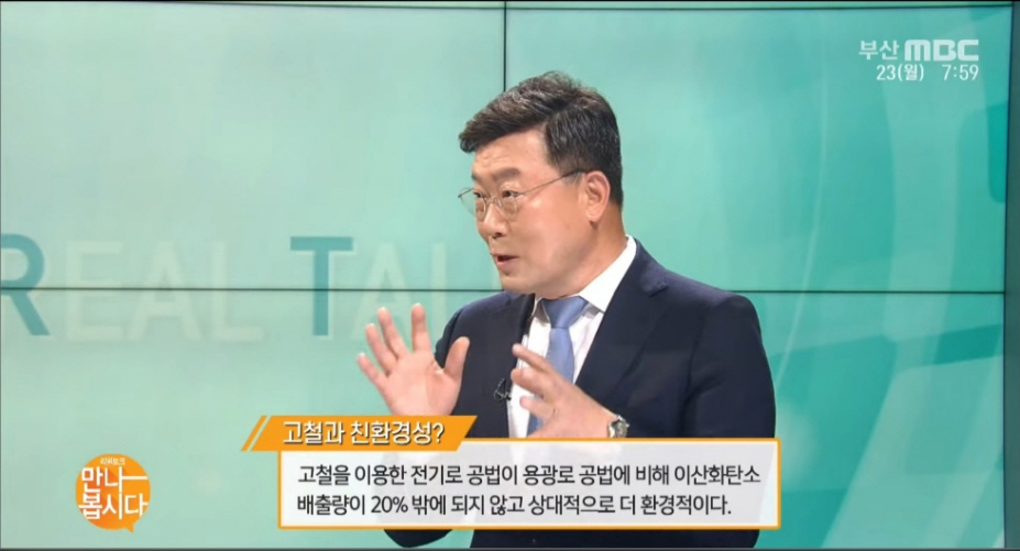 김경식 소장은 5월 23일 방영된 부산MBC의 '리얼토크-만나봅시다'에서 철강산업의 이산화탄소 저감 방법으로 △철스크랩을 활용하는 전기로 공법의 확대 △코크스 대신 환원재로 가스를 사용하는 방법 △수소환원제철 등 철강산업 발전 방향을 설명했다.