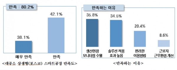 중소기업중앙회(회장 김기문)가 중소벤처기업부, 포스코와 함께 추진한 2019년~2021년 ‘대·중소 상생형(포스코) 스마트공장 사업’ 참여기업 202개사를 대상으로 의견조사를 실시한 결과, 중소기업 10곳 중 8곳(80.2%)이 ‘만족’하고 있으며 만족하는 이유로 ▲생산현장 모니터링 수월(35.8%) ▲솔루션 적용 효과 높음(34.6%) 등을 꼽았다.