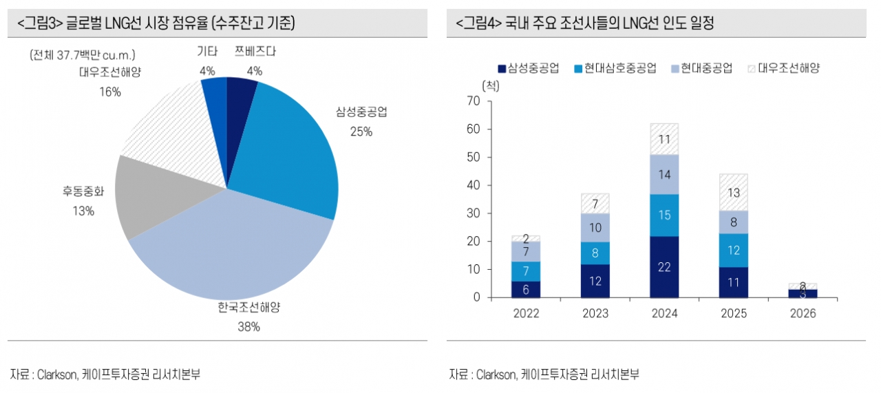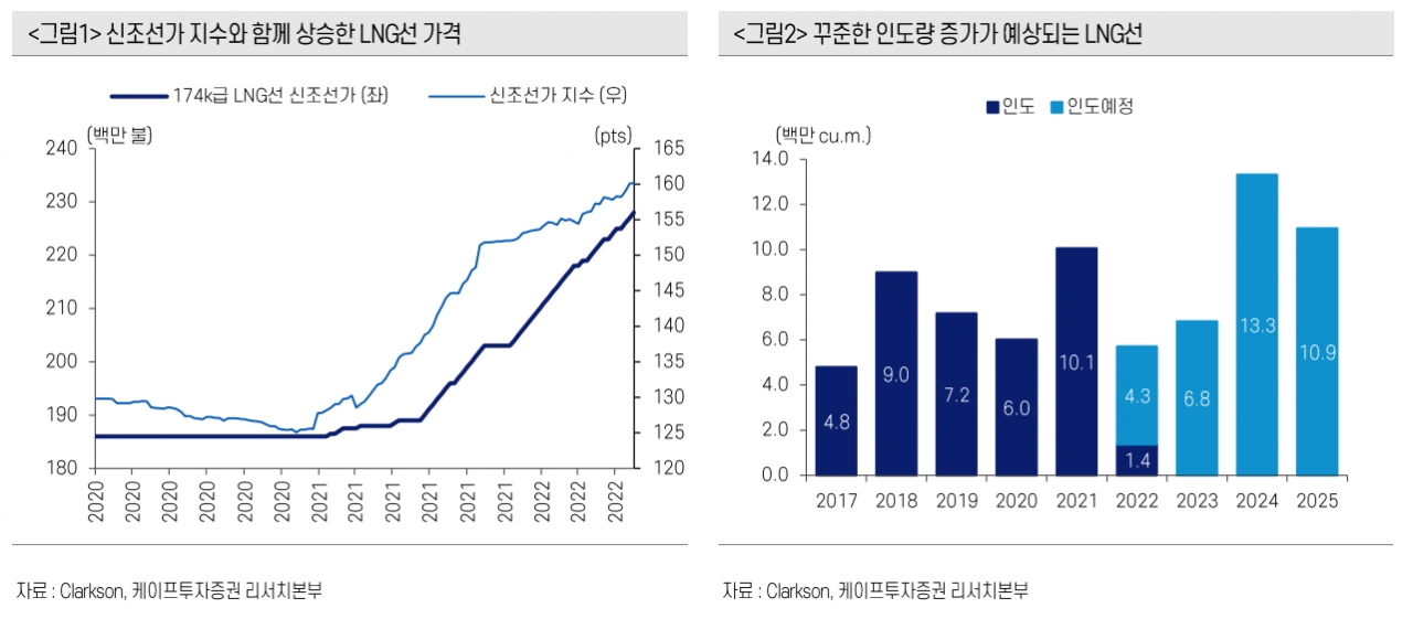 또한 그는 LNG 도크 예약이 채워지기 시작하면서 신조선가 추가 상승 여력이 충분하다고 예견했다. 김 연구원은 “카타르가 선가 인상안을 수용한 이유는 국내 조선 3사 이외에서 프로젝트용 LNG선 건조 물량을 감당할 조선사가 없다는 점 때문”이라며 “일부에서 중국 LNG선 수주 소식을 우려하고 있으나 국내 LNG선 수주 외 물량은 선주사가 중국 고객에게 보여주기식 중국 발주를 진행하는 것으로 국내 조선사들 프리미엄은 계속해서 유지될 것”이라고 주장했다.