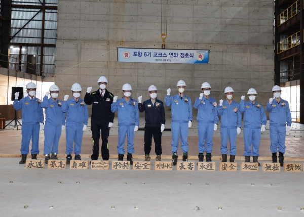 포스코는 지난 17일 포항제철소 신규 코크스공장의 성공적인 공사 수행과 안정 조업을 기원하는 마음을 담아 내화(耐火)벽돌에 글을 새기는 '연와정초식'을 개최했다.