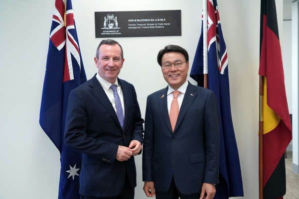 포스코그룹 최정우 회장이 마크 맥고완 서호주 수상을 만나 지원을 당부했다 (오른쪽이 최정우 포스코그룹 회장)/사진제공 포스코그룹