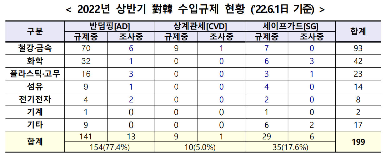 1일, 산업통상자원부는 서울 강남구 삼성동 무역협회에서 열린 '2022년 상반기 '수입규제 협의회'에서 지난달 기준으로 26개국에서 총 199건의 대한(對韓) 수입 규제 조치를 시행 중이라고 밝혔다.