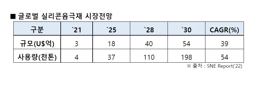 이 때문에 국내외 배터리 제조사들은 실리콘음극재 함량을 높일 수 있는 기술 개발에 주력하고 있다. 실리콘음극재 시장규모는 2030년까지 매년 39% 씩 성장할 것으로 예상돼, 현재 5% 미만인 실리콘음극재 함량이 2025년에는 10% 이상, 2030년에는 25% 이상으로 확대될 것으로 전망된다.
