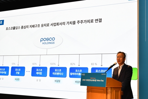 포스코홀딩스 전중선 경영전략팀장은 “철강 중심의 사업구조로 인해 포스코홀딩스의 주가 추이는 철강 시황에 따라 등락을 반복하는 순환적 흐름을 보여왔다”며, “이러한 흐름에서 벗어나 우상향하는 성장형 그래프로 전환하기 위해 이차전지소재, 수소 등 신성장사업에 집중하고 그룹의 균형성장을 가속화하겠다.”고 말했다.