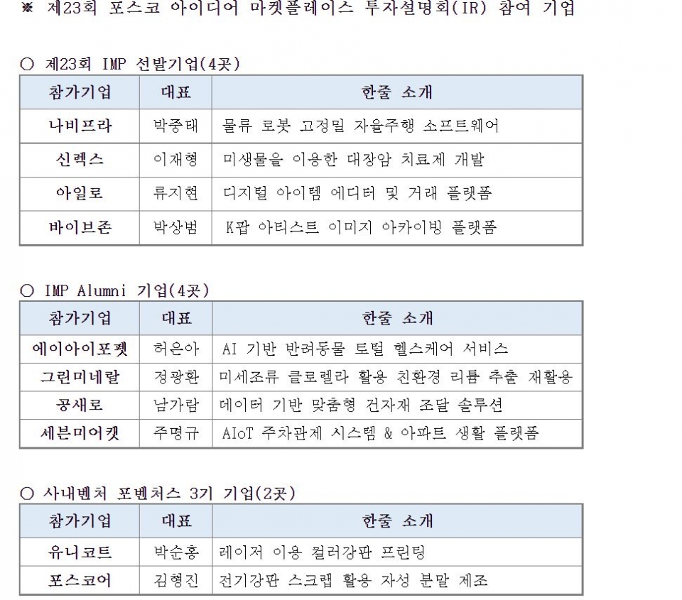 초기 벤처기업 지원을 강화하기 위해 2020년부터 지원대상을 예비창업자 및 3년 미만의 유망 스타트업으로 변경하고 투자여부까지 결정해 IMP기업을 선발했으며, 올해부터는 포스코그룹과 벤처기업들간 사업 매칭 기회를 확대하기 위해 매칭 참여 회사를 당초 포스코, 포스코인터내셔널, 포스코건설, 포스코에너지, 포스코ICT 등 5개사에서 포스코스틸리온과 포스코모빌리티솔루션을 포함 7개사로 확대했다.