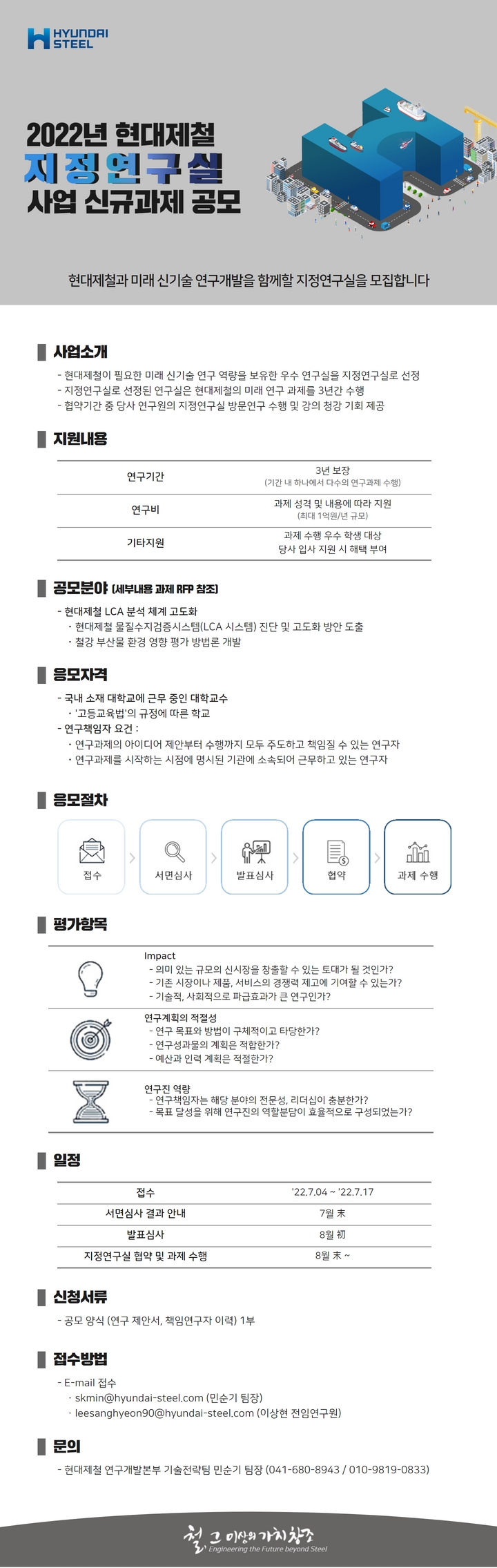 공모 희망자는 첨부된 공모 양식을 토대로 연구 제안서와 책임연구자 이력을 작성한 후 이메일(skmin@hyundai-steel.com, 민순기 팀장/ leesanghyeon90@hyundai-steel.com, 이상현 전임연구원)로 접수하면 된다.