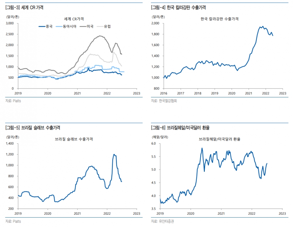 게다가 이현수 연구원은 브라질 CSP 슬래브 가격과 유럽향 냉연강판 수출 가격의 약세를 전망했다. 이 연구원은 “연초 이후 우크라이나 전쟁 등의 이유로 유럽 냉연강판 가격 및 브라질 슬래브 수출 가격이 3월 하순까지 가파르게 상승했다”라며 “그러나 4월 이후 양 제품의 가격 하락세가 빠르게 나타나면서 냉연류 수출과 브라질 CSP 수익성에 부정적인 영향을 미칠 것으로 전망한다”라고 밝혔다.