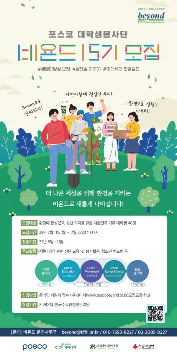 포스코가 대학생봉사단 비욘드 활동 주제를 친환경으로 개편하고, 미래 환경리더로 성장할 비욘드 15기 단원 모집에 나섰다.