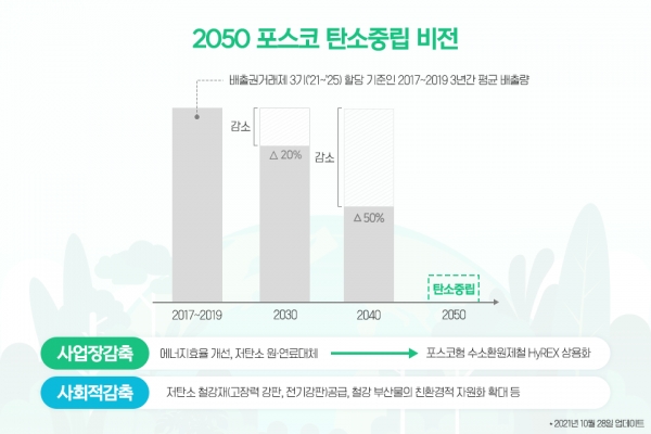 세계철강협회는 철강제품의 생산부터 사용단계를 포괄하는 LCA(Life Cycle Assessment) 관점에서 철강의 친환경성에 주목한다. 이에 따라 철강 생산과정 및 제품개발을 통해 사회 전반의 탄소감축을 위한 철강업계의 중점 사항을 아래와 같이 3가지로 규정한다. 2017~2018년 포스코의 평균 탄소 배출량은 총 78.8백만톤으로 포스코는 사업장감축과 사회적감축 수단을 병행해 2030년에는 20%, 2040년에는 50% 를 감축하고, 2050년에는 탄소 중립을 달성에 나서고 있다. 이에 포스코는 3대 전략 브랜드를 중심으로 친환경 미래 성장시장을 선점하고 초일류 제품경쟁력을 갖춘 친환경 철강기업으로 거듭나고자 한다.
