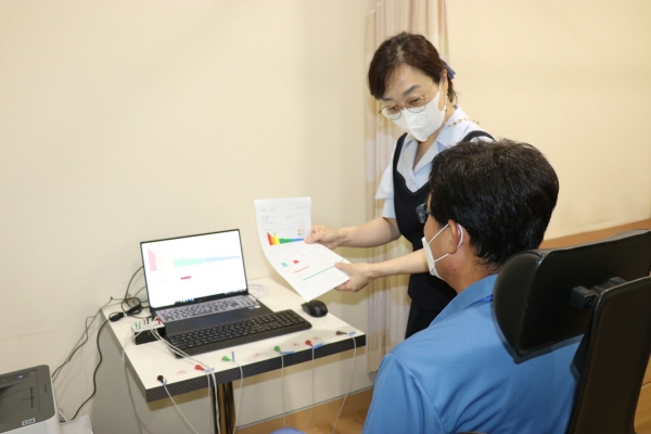 광양제철소 건강증진센터(센터장 채지혜)는 신청 인원들을 대상으로 뇌파·맥파를 분석해 두뇌 건강상태를 측정하고, 검사 결과를 바탕으로 직원 개인별 맞춤형 스트레스 관리를 돕고 있다.