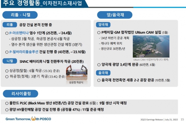 포스코홀딩스는 컨퍼런스 콜을 통해 주요 경영활동으로 이차전재 소재사업인 리튬·니켈, 양/음극재, 리사이클링 사업과 관련한 경영성과 및 진행 상황을 소개했다.