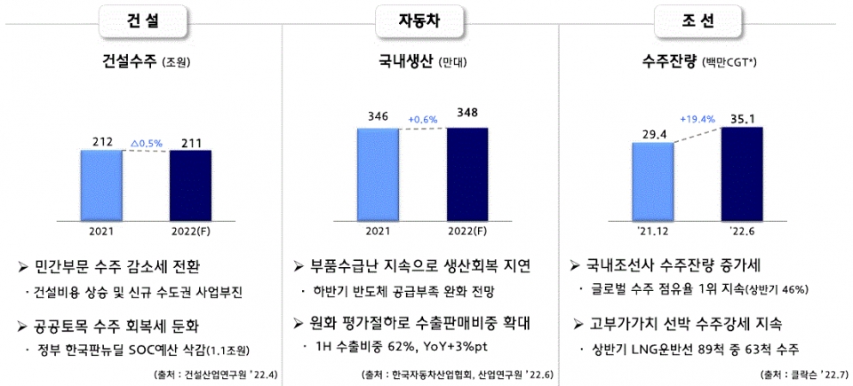 현대제철이 국내 수요산업 관련 올해 민간부문에서 건설 수주가 감소세로 전환되고 부품 수급난이 지속되면서 자동차 산업 회복도 다소 지연될 것으로 전망했다. 반면 조선 산업은 LNG선박 중심으로 수주잔량의 안정적인 증가세를 예상했다.