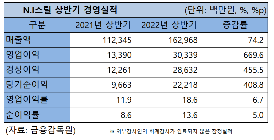 아울러 N.I스틸의 반기순이익은 222억1,800만원으로 전년 동기 대비 125억5,500만원, 130% 급증했다. 이에 상반기 순이익률이 13.6%로 전년 동기 대비 5%p 상승했다. 영업이익률은 18.6%로 전년 동기 대비 6.7%p 상승했다.