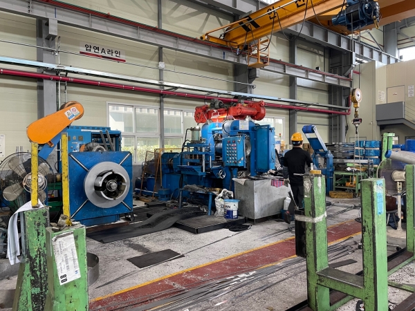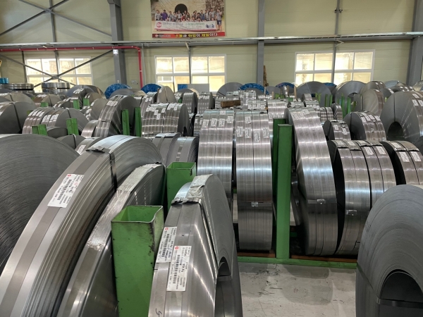 특수 제작된 코일 꽂이로 코일을 관리한다는 점도 인상적이었다. 그간 방문한 업체들에서는 각목과 고무 등 소재의 코일 지지대와 코일 위에 코일을 쌓아올린 광경을 봐왔다. 당초 코일 옆을 지나가면서 필자는 10톤이 넘는 코일이 떨어진다면 분명 필자가 크게 다칠 것이라 불안했던 적이 있었다. 그러나 대홍코스텍의 공장에서는 옆으로 나란히 정렬된 코일을 보니 묘한 안정감을 느꼈다.