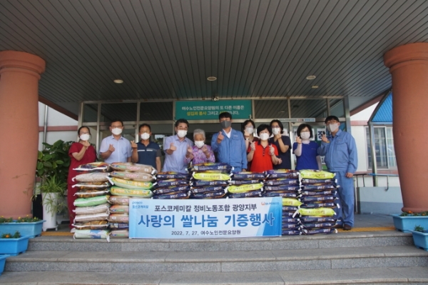 포스코케미칼 노동조합 광양지부는 여수시 율촌면의 사회복지시설인 여수노인전문요양병원을 방문해 사랑의 쌀 나눔 행사로 백미 800kg을 전달했다.