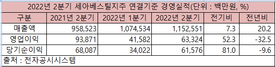 7월 28일 세아베스틸지주(각자대표 이태성, 양영주)의 잠정 실적 공시에 따르면 2분기 연결기준 매출은 1조1,525억5,100만원으로 전 분기 대비 7.3%, 전년 동기 대비로는 20.2% 증가했다. 영업이익은 633억2,400만원으로 전 분기 대비 52.3% 증가했으나, 전년 동기 대비로는 32.5% 감소했고, 당기순이익은 615억7,600만원으로 전 분기 대비 81.0% 증가했으나, 전년 동기 대비로는 9.6% 감소했다.