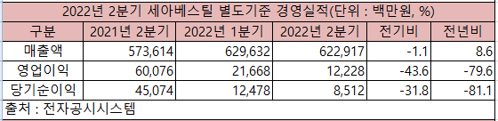 다만, 2분기 공장 화재 사고 및 화물연대 파업 영향 등에 따른 제품 생산에 차질이 발생하면서 제조원가가 증가함에 따라, 계절적 성수기임에도 전년 동기 대비 영업이익이 축소됐다.