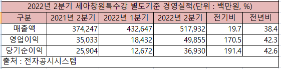 세아창원특수강의 2분기 매출은 5,179억3,200만원으로 전 분기 대비 19.7%, 전년 동기 대비 38.4% 증가했다. 영업이익은 498억5,500만원으로 전 분기 대비 170.5%, 전년 동기 대비 42.3% 증가했고, 당기순이익은 369억3,000만원으로 전 분기 대비 191.4%, 전년 동기 대비 42.6% 증가했다.