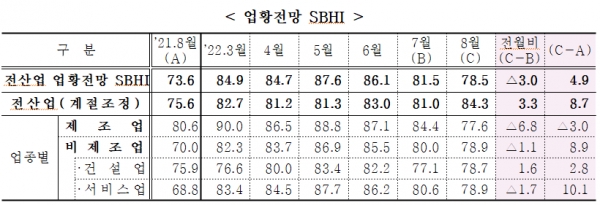 2022년 8월의 SBHI와 최근 3년간 동월 항목별 SBHI 평균치와 비교해보면 제조업에서는 원자재 전망을 제외한 경기전반, 생산, 내수, 수출, 영업이익, 자금 사정 전망은 물론 역계열인 설비·재고·고용전망 모두 이전 3년 평균치보다 개선될 것으로 전망되고 비제조업은 모든 항목에서 개선될 것으로 조사됐다.
