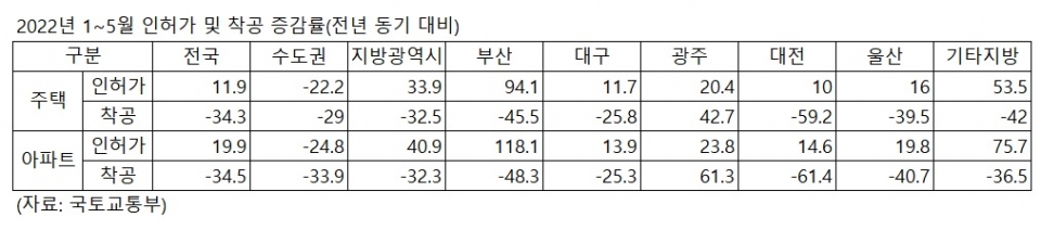 건설산업연구원에 따르면 2022년 1~5월 누계 기준으로 지방을 중심으로 인허가는 증가하였으나 착공은 감소하는 현상이 나타났다. 수도권은 인허가와 착공이 동시에 감소하였고 유형별로도 아파트와 아파트 외 주택 모두에서 감소했다.