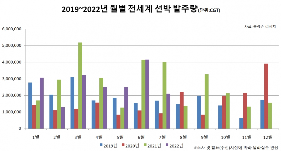 조선·해운 분석기관인 클락슨 리서치에 따르면 지난 7월 세계 선박 발주량은 210만CGT(표준 화물선 환산 톤수)를 기록했다. 올해 월별 최고 발주량을 기록한 전월보다 절반 가까이 감소했다.