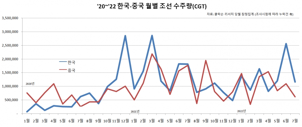 그럼에도 국내 조선업계는 높은 건조 기술력과 수주 경쟁력으로 19척, 116만CGT를 수주했다. 국내 조선업계는 7월 수주 점유율 55%를 차지하며 62만CGT를 수주한 중국에 앞섰다. 중국은 35척 수주 실적이 인정됐음에도 중소형 벌크선 위주의 수주로 계약 가격과 선박 누적 중량은 국내 조선소에 밀리게 됐다.
