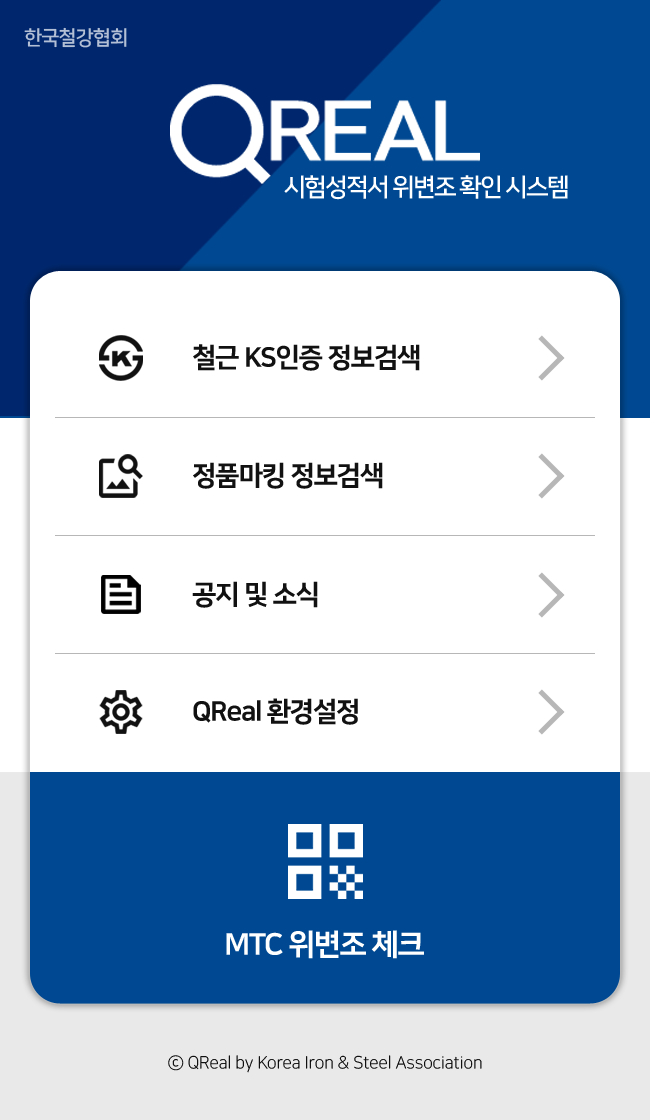 QReal은 정품 철강재 확산을 위해 한국철강협회가 개발한 애플리케이션으로 애플 앱스토어 및 구글 플레이에서 누구나 무료로 사용할 수 있다.