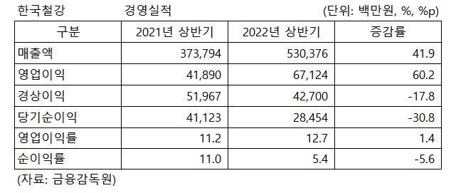 이로써 한국철강의 2022년 상반기 매출액 영업이익률은 12.7%를 기록해 2021년 상반기의 11.2% 대비 1.4%p 증가했다. 반면, 매출액 순이익률은 5.4%로 2021년 상반기의 11% 대비 5.6%p 감소했다.