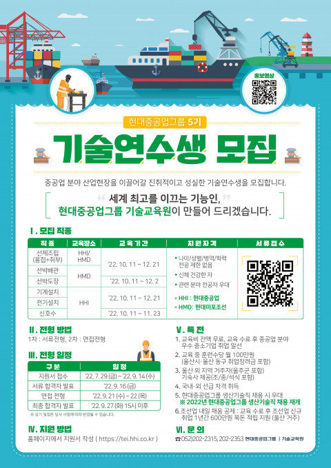 현대중공업과 현대미포조선이 현대중공업그룹 5기 기술연수생을 모집한다. 양 사는 통합 모집으로 서로 간 기술 교육진 및 교육 인프라를 공유하며 더 체계적인 현장 맞춤형 지도에 나설 예정이다.