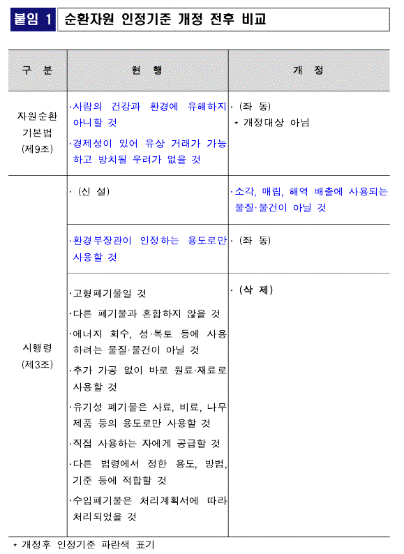 시행령 개정을 통해 '환경부 장관이 인정하는 용도로만 사용할 것'을 제외한 나머지 8개 시행령상 기준을 모두 없애기로 했다. 대신 '소각·매립·해역배출에 사용되는 물질·물건이 아닐 것'이라는 기준을 신설하기로 했다.